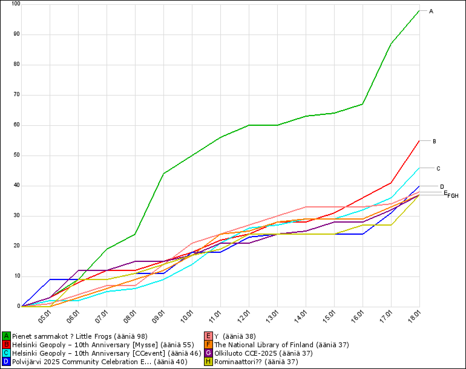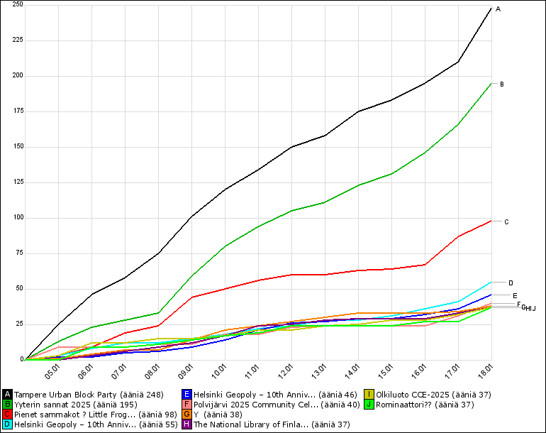 Äänestyksessä äänestettiin parhaita kätköjä vuonna 2025 julkaistujen normaalikätköjen ja vuonna 2025 järjestettyjen miittien joukosta.